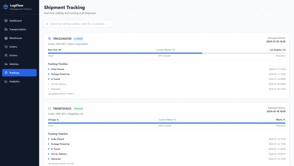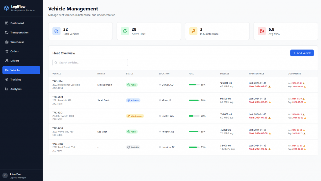 - Lộ trình & điều phối: Tối ưu tuyến đường, điều phối xe, cập nhật trạng thái